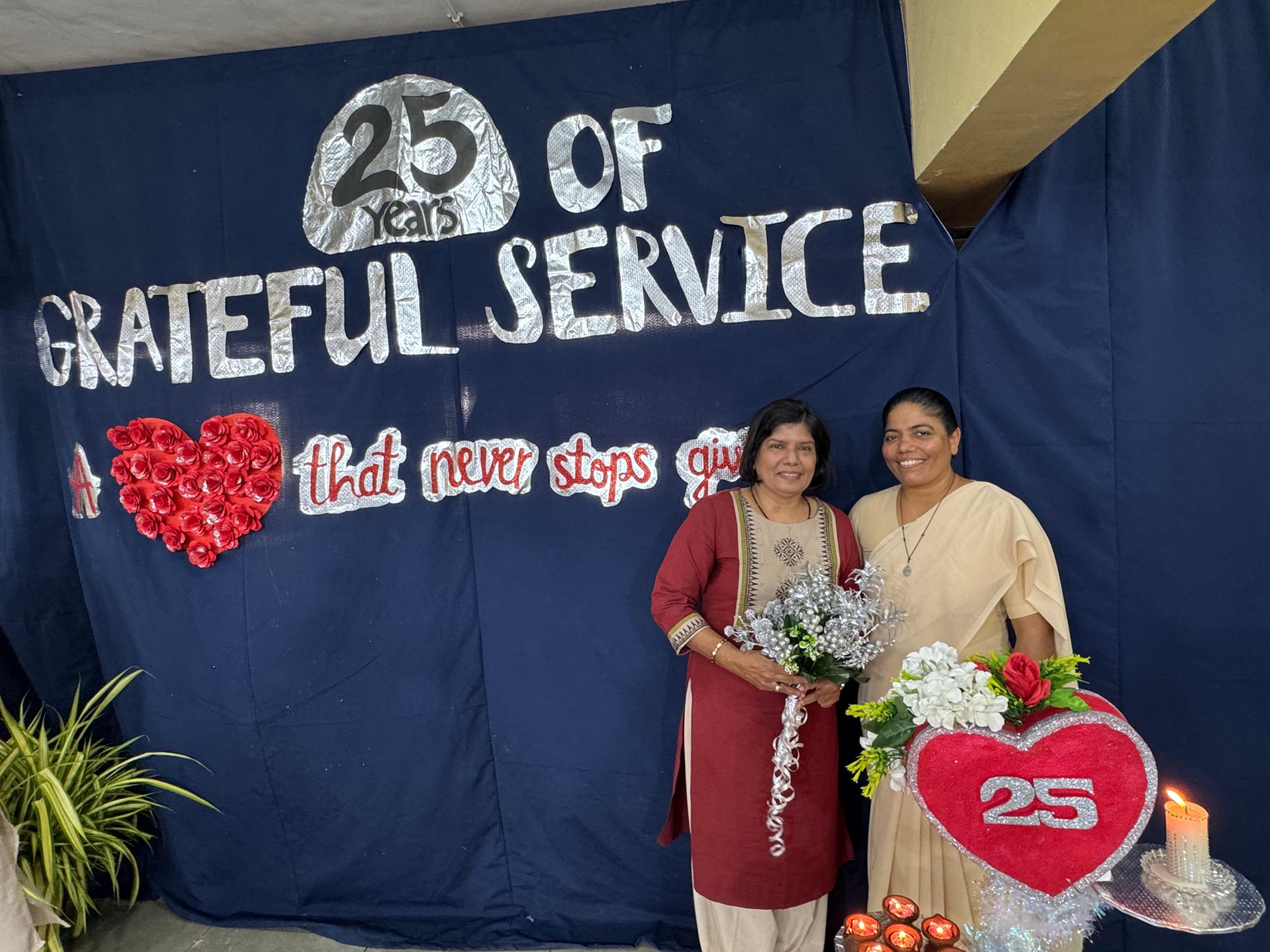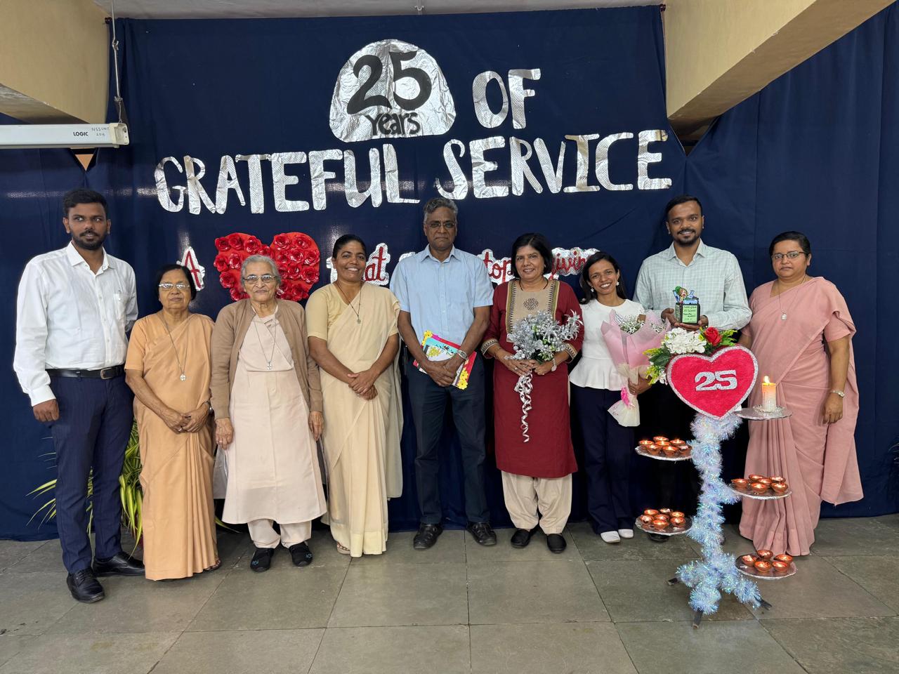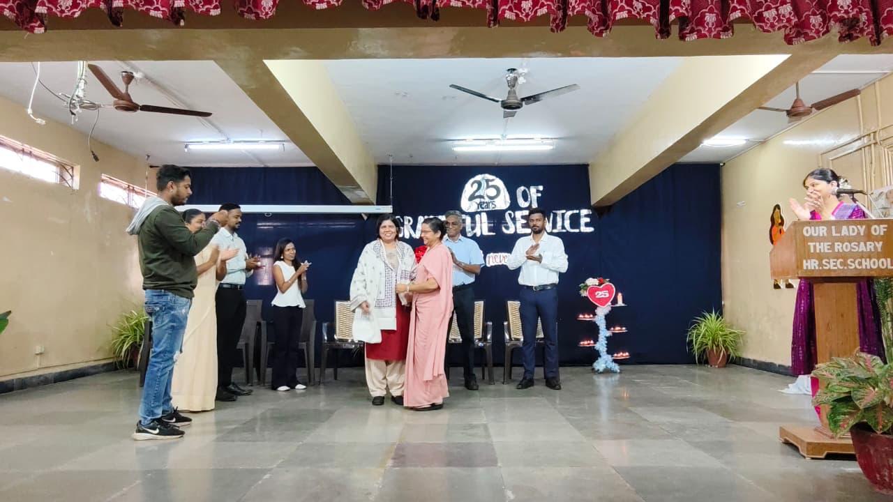 Ms. Sunita George completed 25 years of dedicated service in Our Lady of the Rosary Higher Secondary School marking a remarkable milestone in her journey. To honor this occasion, a prayer service was on conducted 16th December 2025 by the student council under the theme “25 Years of Grateful Service – A Heart That Never Stops Giving.” Students of Class 11 Science presented a meaningful prayer dance, followed by a candle-lighting ceremony. Ms. Sunita carried the candle symbolizing her 25 years of service, while 24 others shared the light to represent how she touched and inspired many lives. The lamps were carried by her family members, the manager, principal, teachers, non-teaching staff, and students of Classes 11 and 12 Science, making the celebration a heartfelt and memorable tribute.