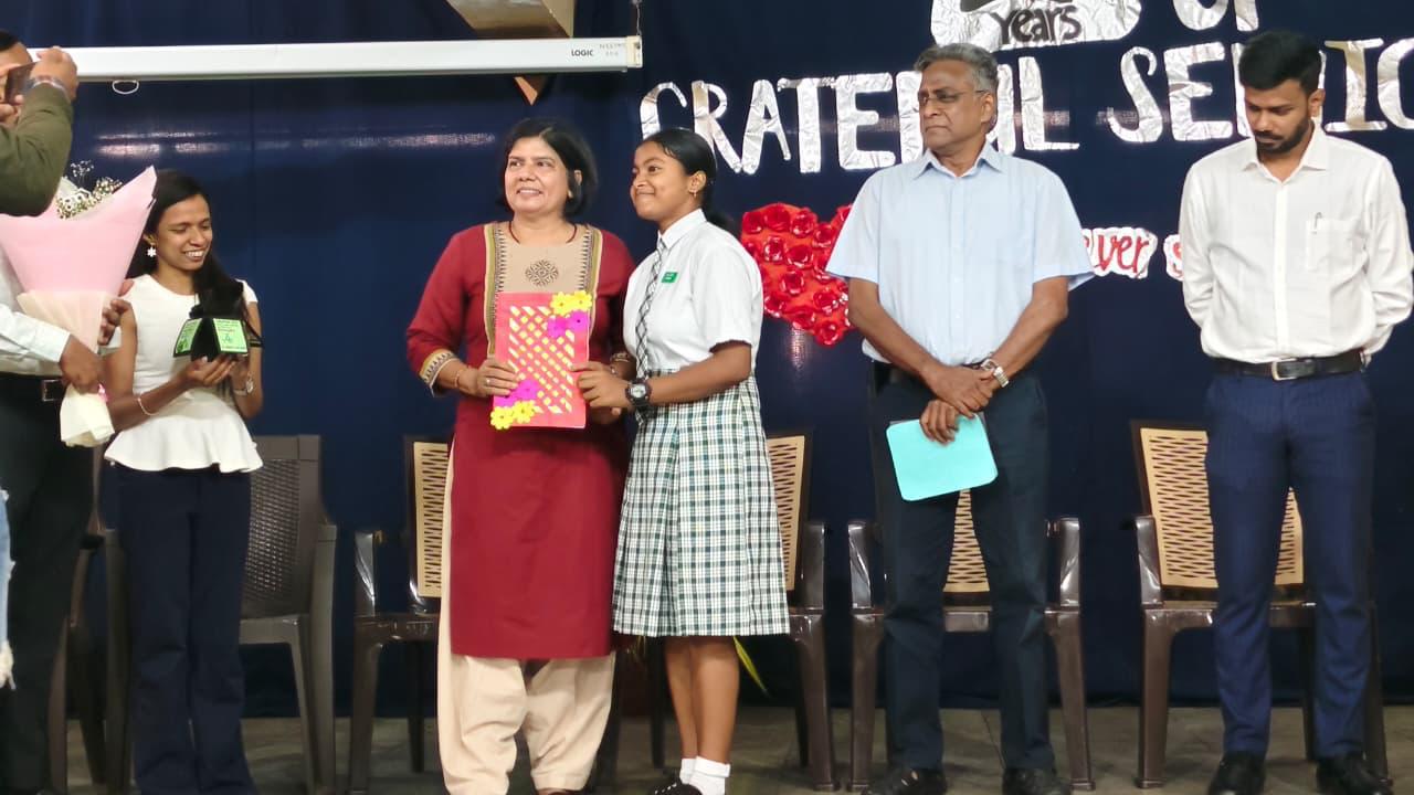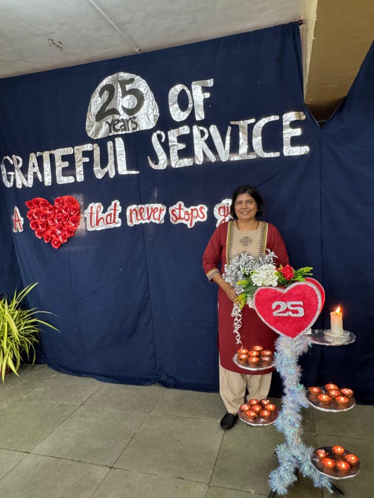 Ms. Sunita was felicitated in recognition of her 25 years of devoted service, followed by a joyful cake-cutting ceremony. A bouquet was presented to her by the Staff Secretary, and each class thoughtfully prepared a card as a token of love and gratitude. The Principal, Sr. Manisha Parmar, spoke warmly about Ms. Sunita’s ever-giving heart and expressed heartfelt appreciation for her years of selfless service. The Staff Secretary, Ms. Kim, also conveyed sincere thanks on behalf of the entire staff, making the occasion both meaningful and memorable.